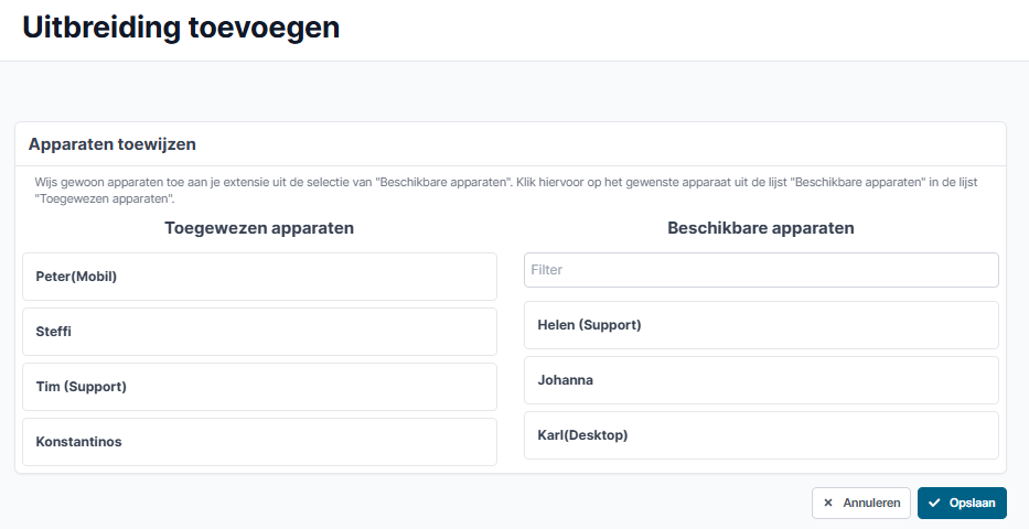Selecteer in het gebied "Extensies en belgroepen" de extensie die u wilt koppelen aan een of meer apparaten.