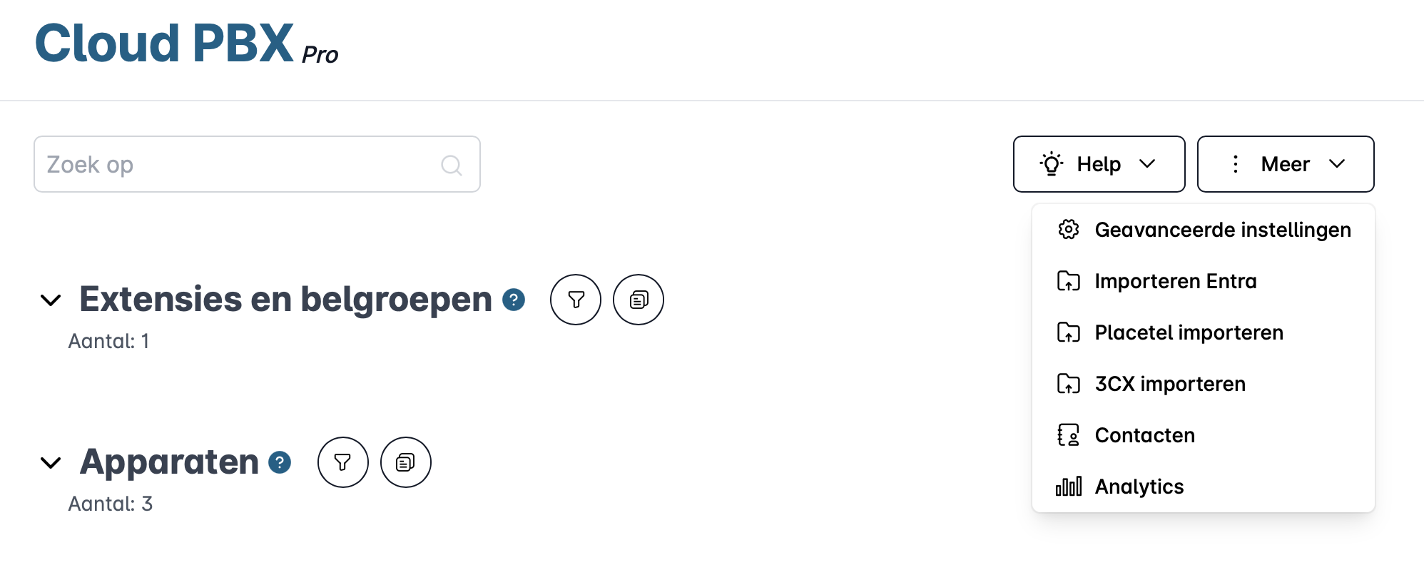 Klik in het overzicht van de cloud telefonie op het veld "Meer" aan de rechterkant en klik vervolgens op "Analytics".