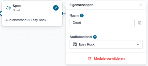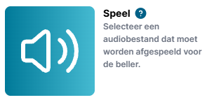 Wanneer deze module wordt bereikt, wordt er een audiobestand afgespeeld voor de beller. Dit kan worden geselecteerd uit de pool van bestanden die zijn opgeslagen in het cloud telefonie als type "IVR, wachtrij & call flow audio".
