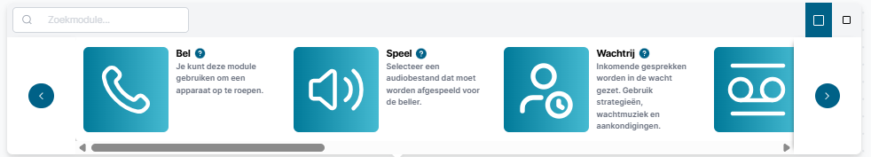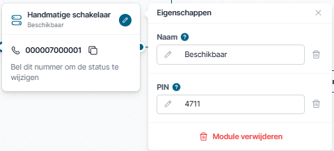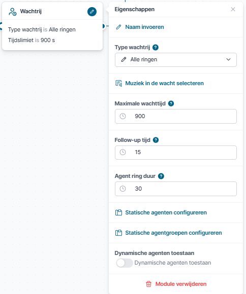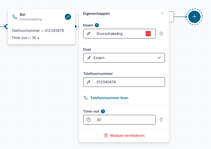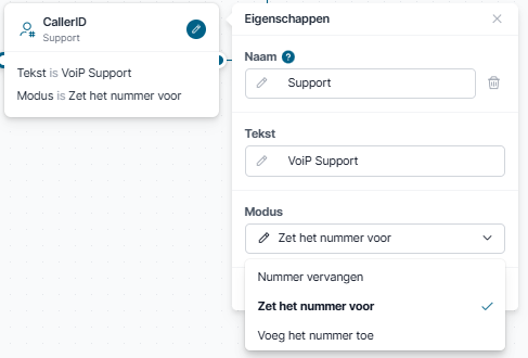 De modules zijn de afzonderlijke functies die in Call Flow kunnen worden gebruikt. Als je een van de modules naar het werkveld sleept of erop klikt, verschijnt deze op het werkveld. Als je op het pictogram "Bewerken" (potlood) klikt, worden de gedetailleerde eigenschappen van de module geopend. Afhankelijk van de functie van de module kunnen of moeten hier verschillende eigenschappen worden geconfigureerd.