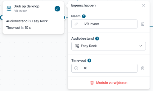 Hiervoor moet een audiobestand worden geselecteerd uit de pool van het cloud telefonie (audiobestandstype "IVR, wachtlussen & call flow audio"). Er kan ook een tijdsduur worden ingesteld waarbinnen een beller een keuze moet maken. De duur van de time-out gaat in als het audiobestand volledig is afgespeeld. De beller kan echter al tijdens het afspelen een keuze maken.
