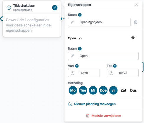 Wordt gebruikt voor tijdgestuurd doorschakelen. Filtert oproepen op basis van tijd en dag van de week en stuurt ze verschillend door. Bijvoorbeeld binnen openingstijden en buiten openingstijden. Om de tijdsperiodes te configureren, maak je gewoon één of meerdere schema's aan en geef je de begin- en eindtijd en de gewenste dagen van de week op. De tijdzone UTC+2 is van toepassing.