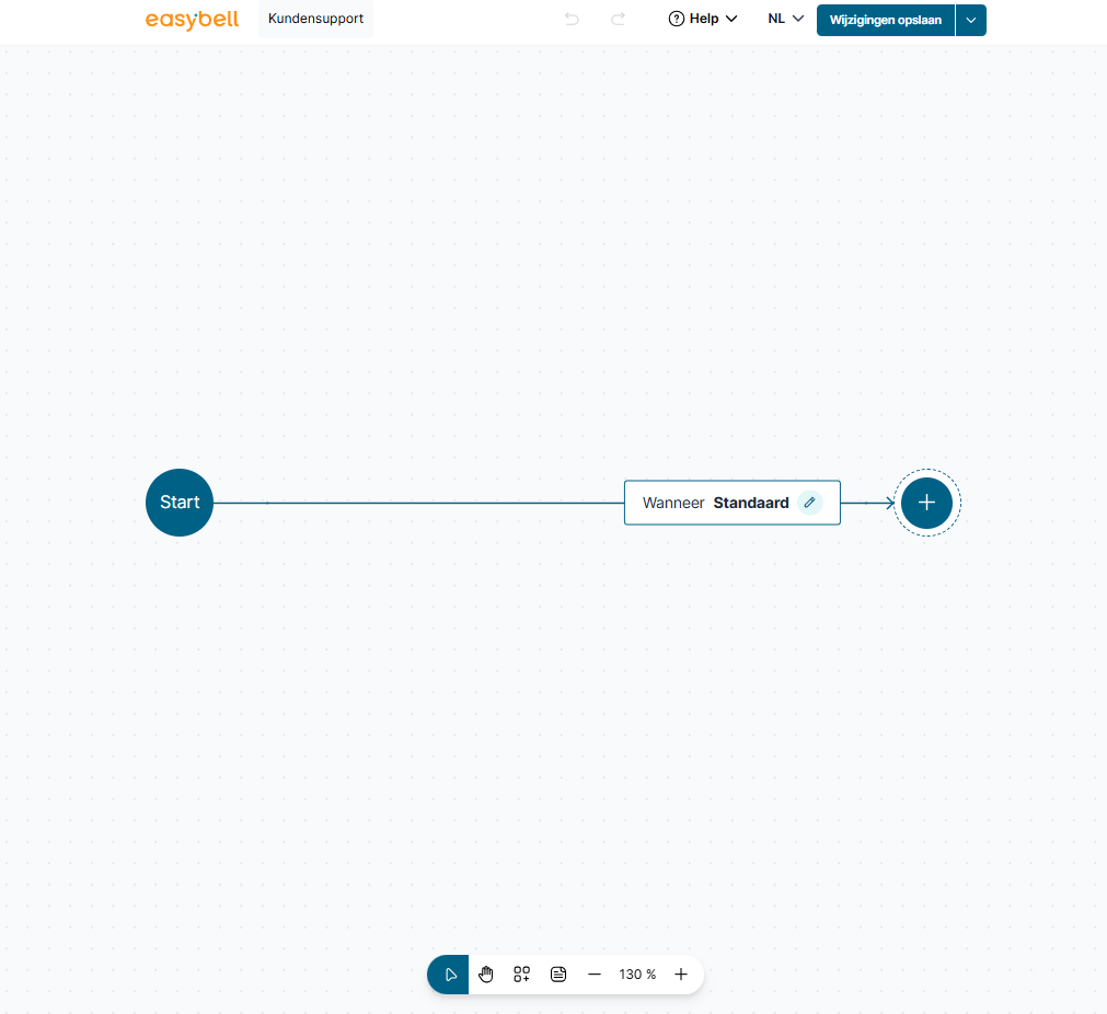 Het werkblad bevat de hoofdbalk bovenaan en de gereedschapskist onderaan. Standaard zijn het startpunt van de call flow en de eerste connector beschikbaar op het werkblad zelf.