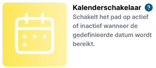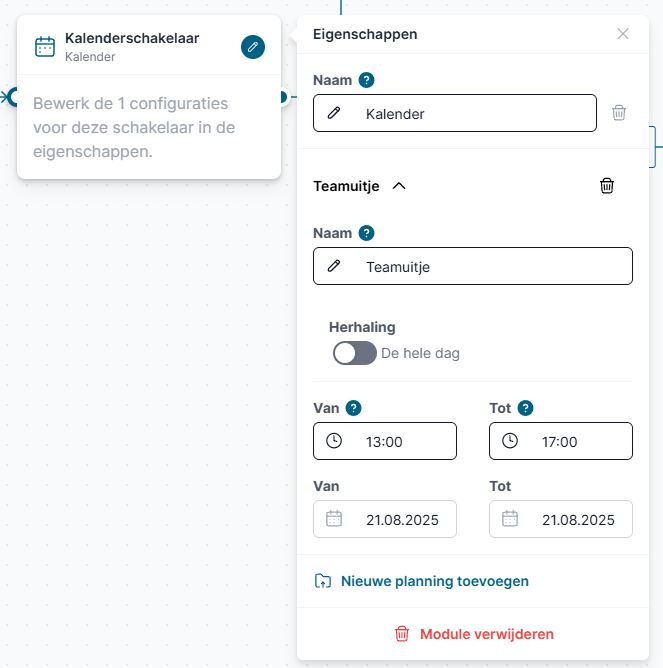 Gebruikt voor datumgestuurd doorschakelen van oproepen. Filtert oproepen op datum (en eventueel tijd) en stuurt ze anders door. Als je bijvoorbeeld wilt dat er rekening wordt gehouden met feestdagen naast de openingstijden, dan laat je deze module de tijdschakeling volgen + zijn "Binnen" connector.