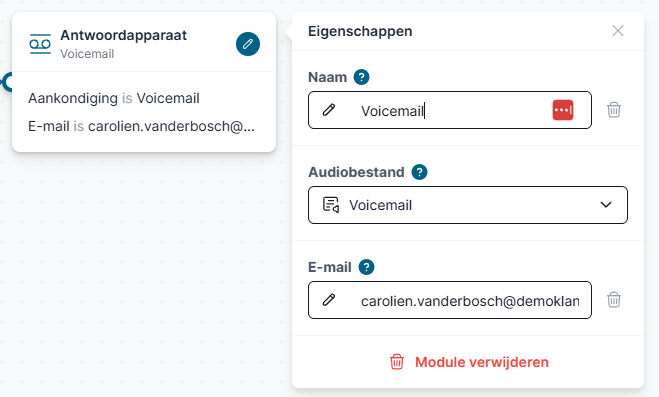 Deze module biedt de mogelijkheid om een oproep door te schakelen naar een antwoordapparaat. De beller krijgt eerst een audiobestand te horen. Dit kan worden geselecteerd uit de audiobestanden van het type "IVR, wachtlussen & call flow audio" die naar het systeem zijn geüpload. Een bericht van de beller wordt opgenomen en omgezet in een audiobestand. Dit bestand wordt vervolgens per e-mail verstuurd naar het e-mailadres dat in deze module is opgegeven.