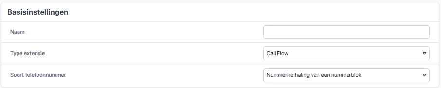 Je hebt toegang tot de Call Flow Creator door een nieuwe extensie aan te maken in je cloud telefonie en het type extensie "Call Flow" te selecteren in de "Basisinstellingen". De telefoonnummer modus kan worden geselecteerd en er moet een naam worden gedefinieerd. We raden aan een unieke naam in te voeren die geschikt is voor deze extensie.