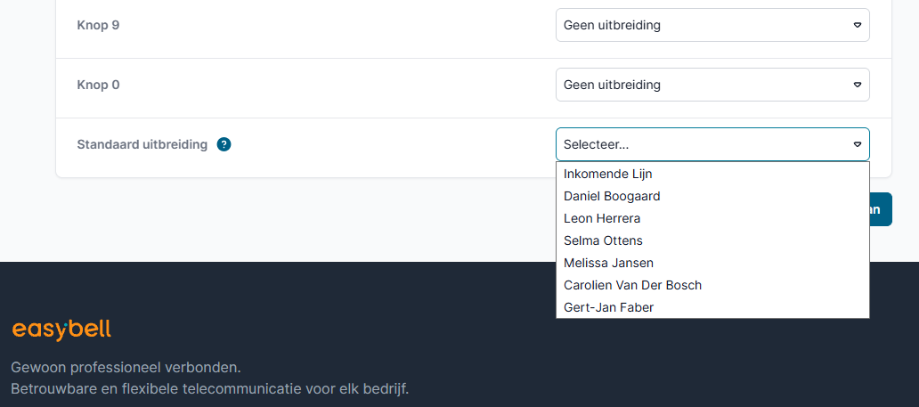 Ten slotte wordt de"Standaard uitbreiding" gedefinieerd. Een gesprek wordt doorgeschakeld naar deze extensie als: