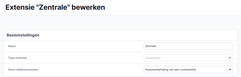 Wanneer je een nieuwe extensie aanmaakt, moet je het nummerblok kiezen en de extensie en interne snelkiesnummers toewijzen. Voor gedetailleerde instructies kijk in: "Extensies of gespreksgroepen aanmaken in de Cloud telefonie".