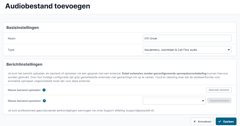Je kunt de begroeting uploaden in het cloud telefonie overzicht in de sectie "Audiobestanden" door op "Voeg toe" te klikken en "Keuzemenu & wachtrij audio" te selecteren als type.