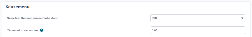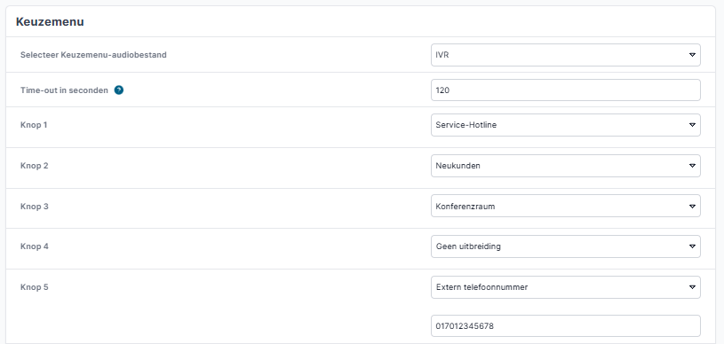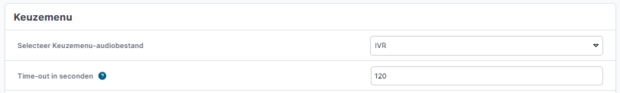 Selecteer eerst het voorbereide audiobestand in het bij "Selecteer Keuzemenu-audiobestand". Gebruik "Time-out in seconden" om de tijd die bellers beschikbaar hebben voor invoer te beperken. De tijd begint pas te tellen als het audiobestand klaar is met afspelen.