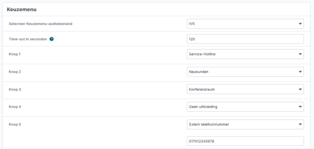 Je kunt kiezen tussen doorschakelen naar extensies en oproepgroepen en naar externe nummers. Voor "Extern telefoonnummer" wordt een extra invoerveld weergegeven waarin het bijbehorende nummer wordt ingevoerd.