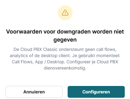 Houd er rekening mee dat als je overschakelt van de Classic of Pro Cloud telefooncentrale naar de Basic versie, alle configuraties van de telefooncentrale verloren gaan. Deze kunnen niet worden hersteld.