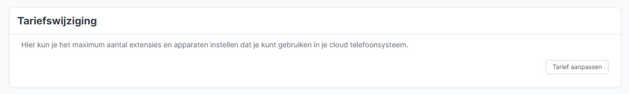 Als je alleen de extensie grootte van je Cloud telefooncentrale abonnement wilt wijzigen, is het voldoende om meer extensies + eindtoestellen aan te maken dan zijn inbegrepen in het huidige abonnement. Het is ook niet mogelijk om meer extensies en toestellen toe te voegen aan de Basic Cloud telefooncentrale, omdat de gratis versie van de Cloud telefooncentrale beperkt is tot vijf extensies en vijf toestellen. Als je het aantal extensies of eindtoestellen van de Basic versie wilt verhogen, wijzig dan eerst uw abonnement naar Classic of Pro en verhoog indien nodig het aantal extensies of eindtoestellen.
