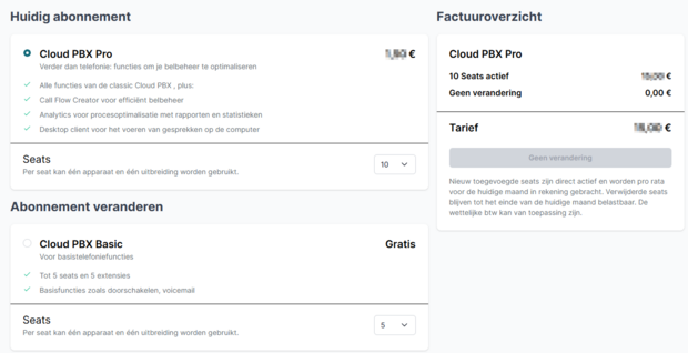 Hier kun je de versie van je cloud telefonie aanpassen, evenals het aantal seats.