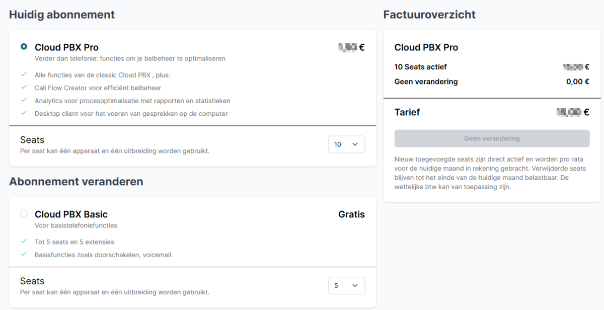 Hier kun je de versie van je cloud telefoonsysteem aanpassen, evenals het aantal seats.